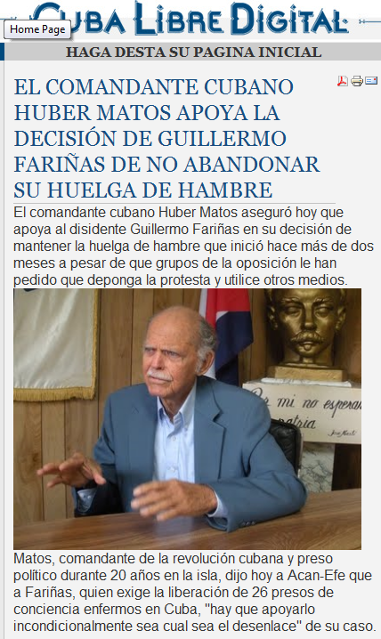 Matos se distanció así de la posición de un grupo de 88 opositores y activistas de derechos humanos en Cuba que a finales de abril pidió a Fariñas que abandone su huelga de hambre para liderar una recogida de 10.000 firmas en la isla para exigir al Gobierno la excarcelación de los presos políticos.