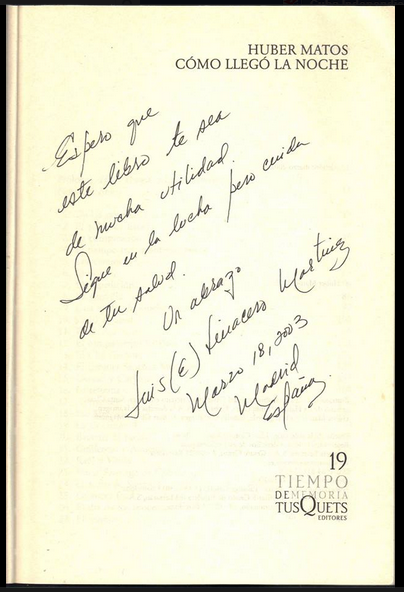 La otra es un ejemplar de su libro titulado CÓMO LLEGÓ LA NOCHE, el cual me dedicó y regaló.